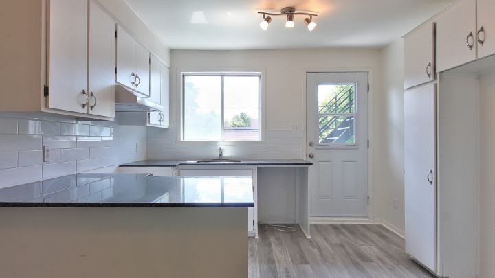 Accommodation located in the basement. Freshly renovated in 2024 with granite countertops, black ceramic backsplash, ceramic bath-shower, high quality floors, new kitchen cabinets, island with granite lunch counter, etc. The apartment offers 1 closed bedroom and a separate washer-dryer area with plenty of storage.