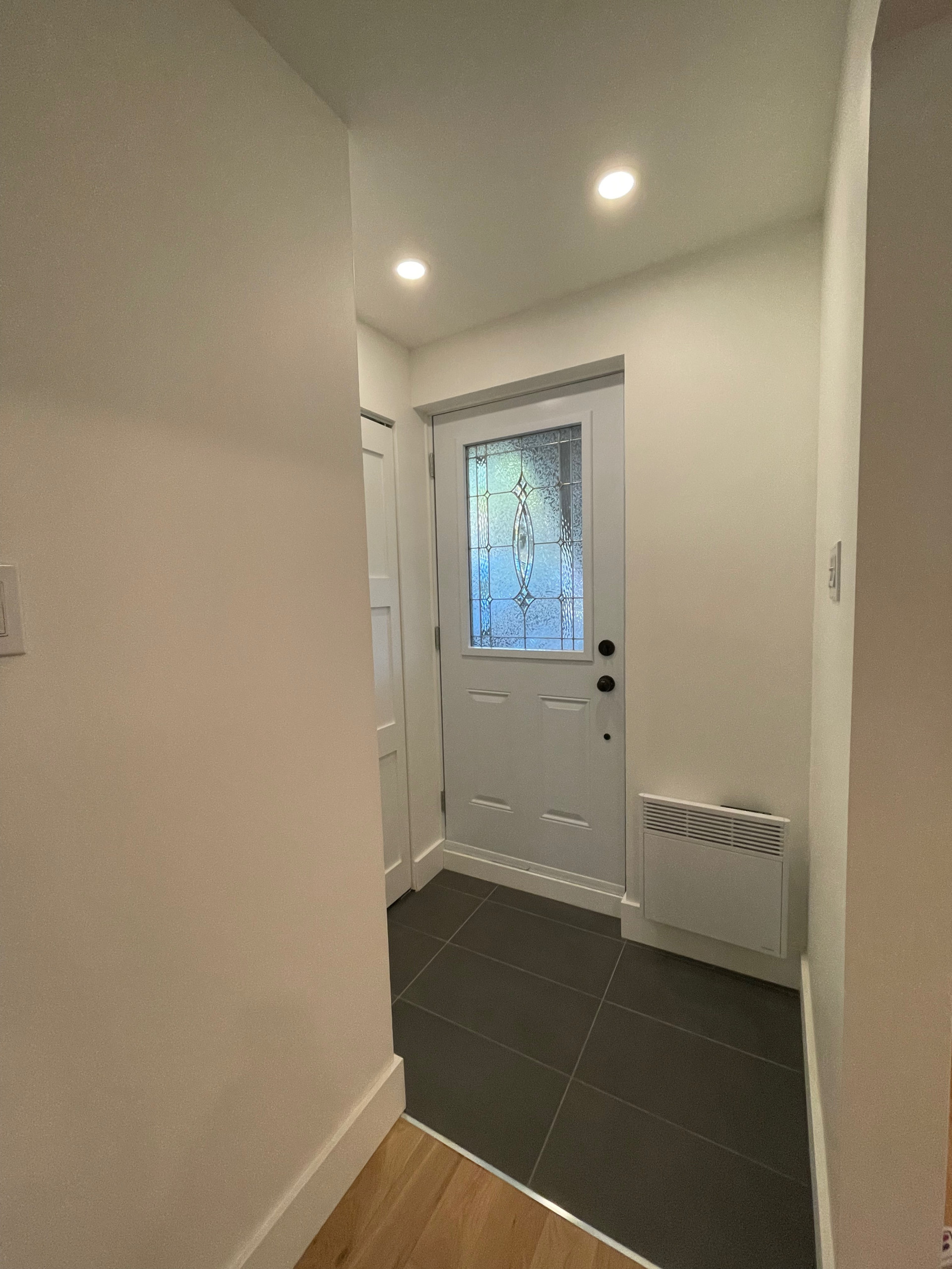 Peint blanc, avec 3 chambres et une cuisine spacieuse. Les planchers sont de bois franc (chêne blanc) ou céramique. L'entrée de laveuse/sécheuse se situe dans la salle de bain.