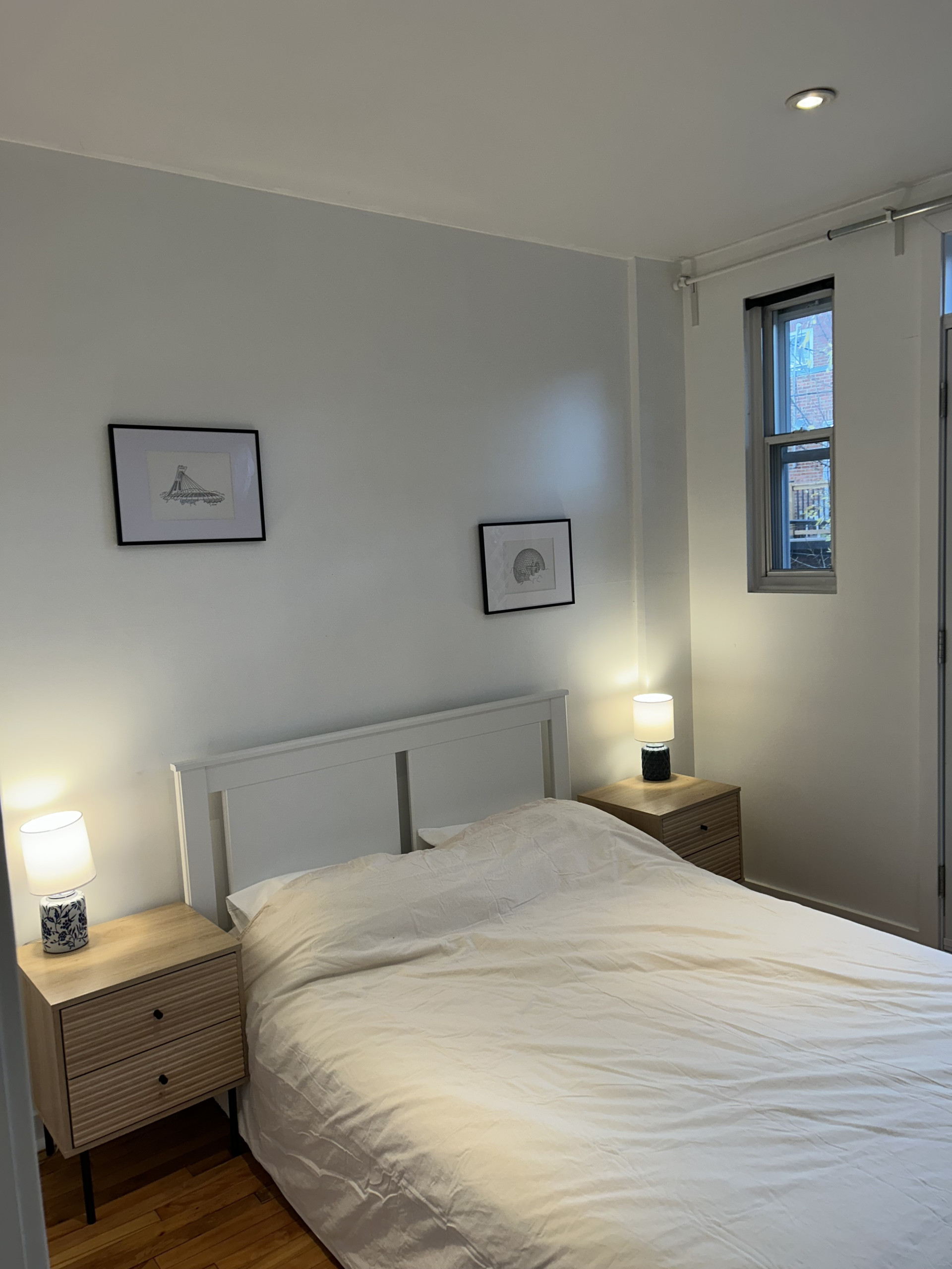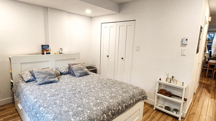 Closed bedroom. Very bright! Hardwood floors. Plenty of storage with two large closets. Beautifully decorated by Montreal artists.