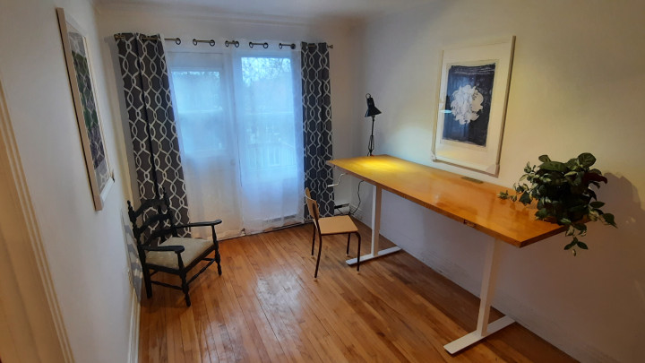 Le logement possède une cuisine et salon ouverts avec porte donnant sur balcon arrière. Vous pouvez y prendre votre petit-déjeuner l'été avec la vue sur les jardins fleuris du bas. Les comptoirs de la cuisine sont de quartz blanc. La salle de bain comprend une douche en verre et céramique éclairée par un puits de lumière. La chambre à coucher est munie d’un grand lit (queen size) et est adjacente à une pièce de travail lumineuse donnant à l’avant de la bâtisse.