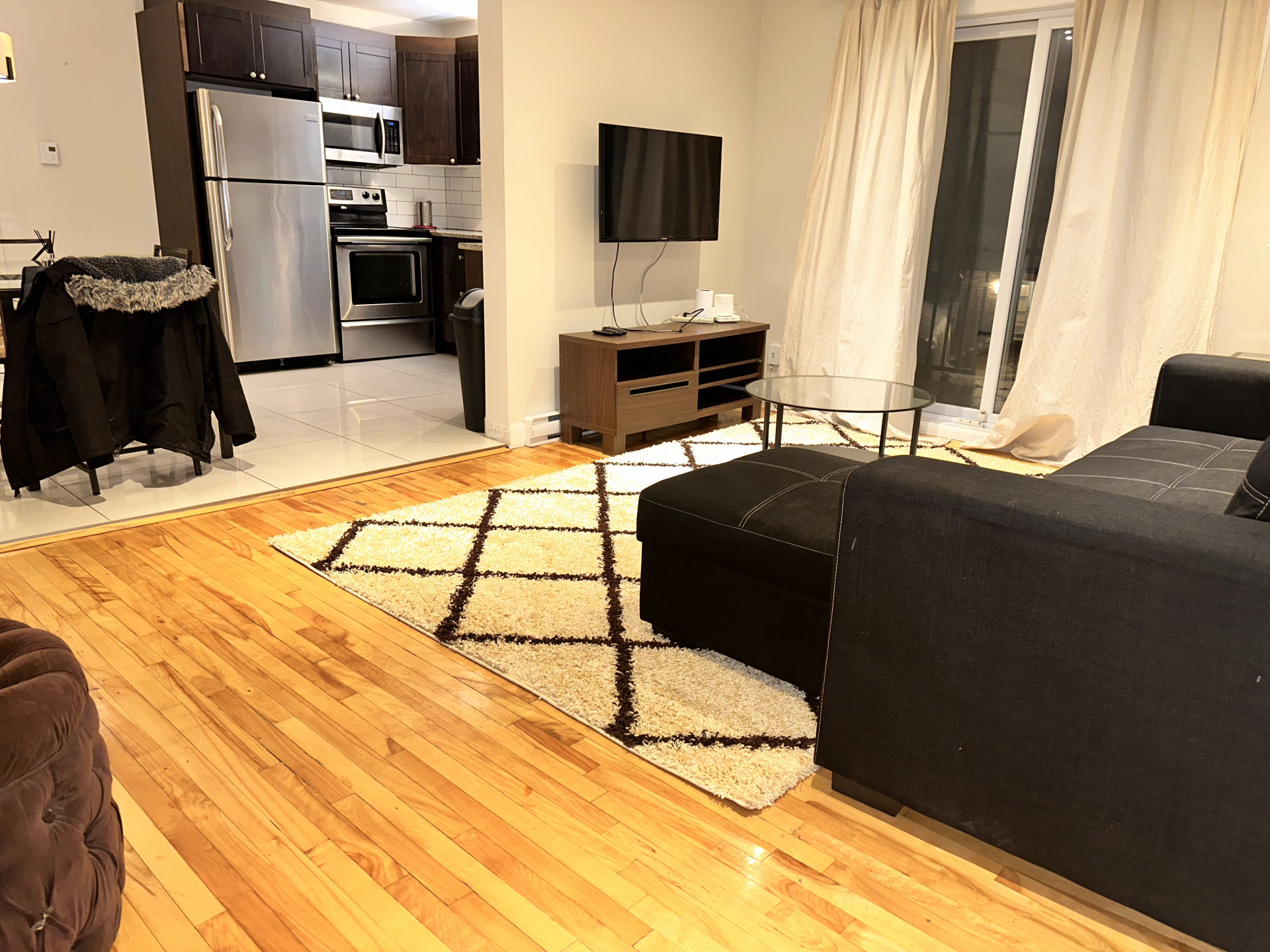 ✅ Living Room: includes a sectional sofa, TV, and balcony/terrace