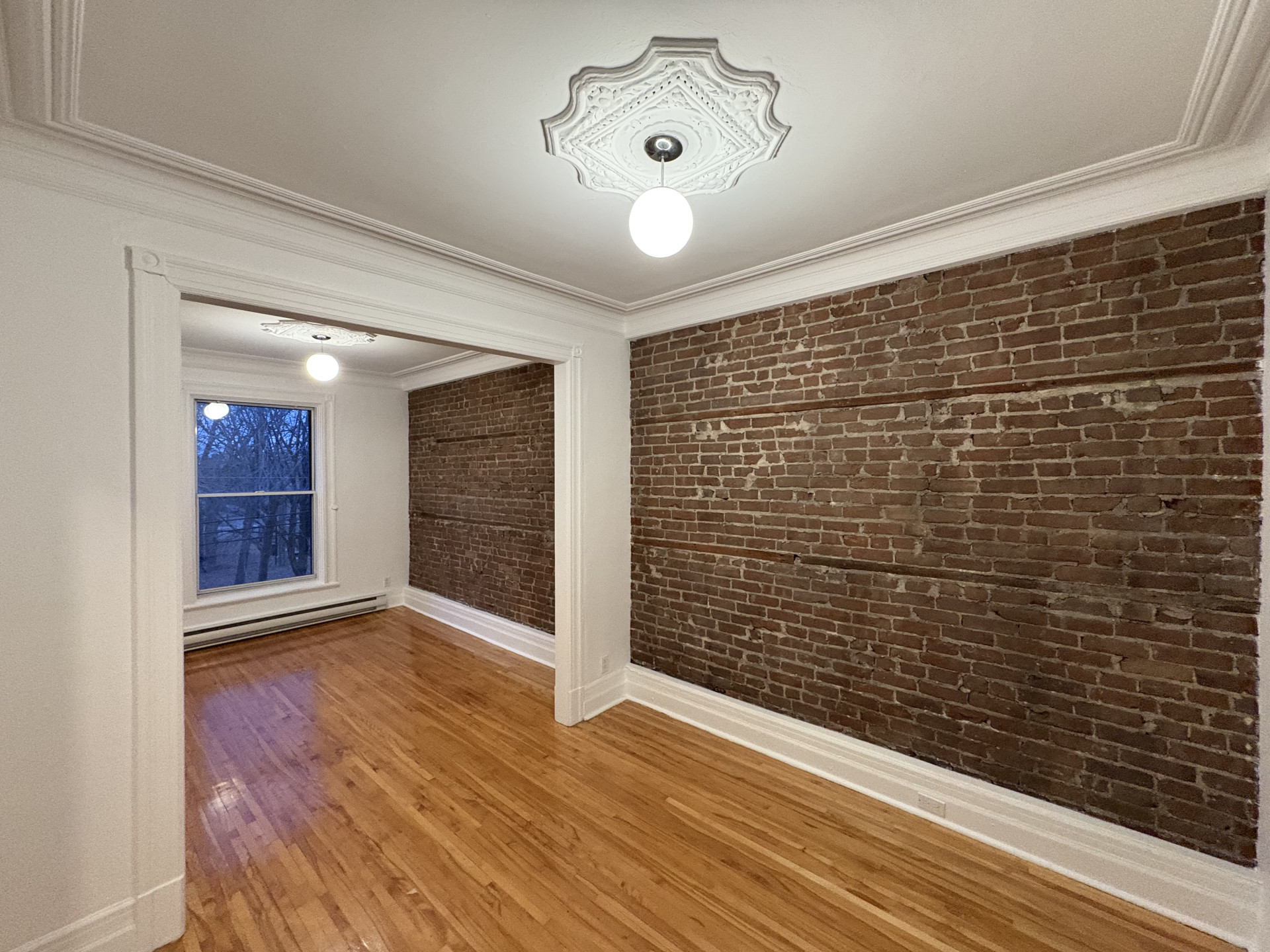 Hardwood floors, exposed brick walls, 9-foot ceilings, and 2 new balconies (front and back). Laundry room in the hallway with side-by-side washer and dryer hookups and storage above. Dishwasher hookup available.