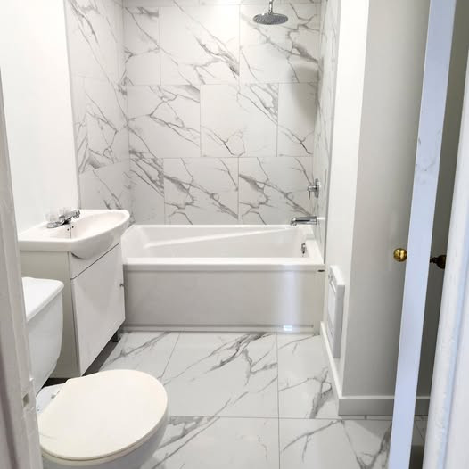 Salle de bain complétement refaite et espace pour laveuse/sécheuse superposées.