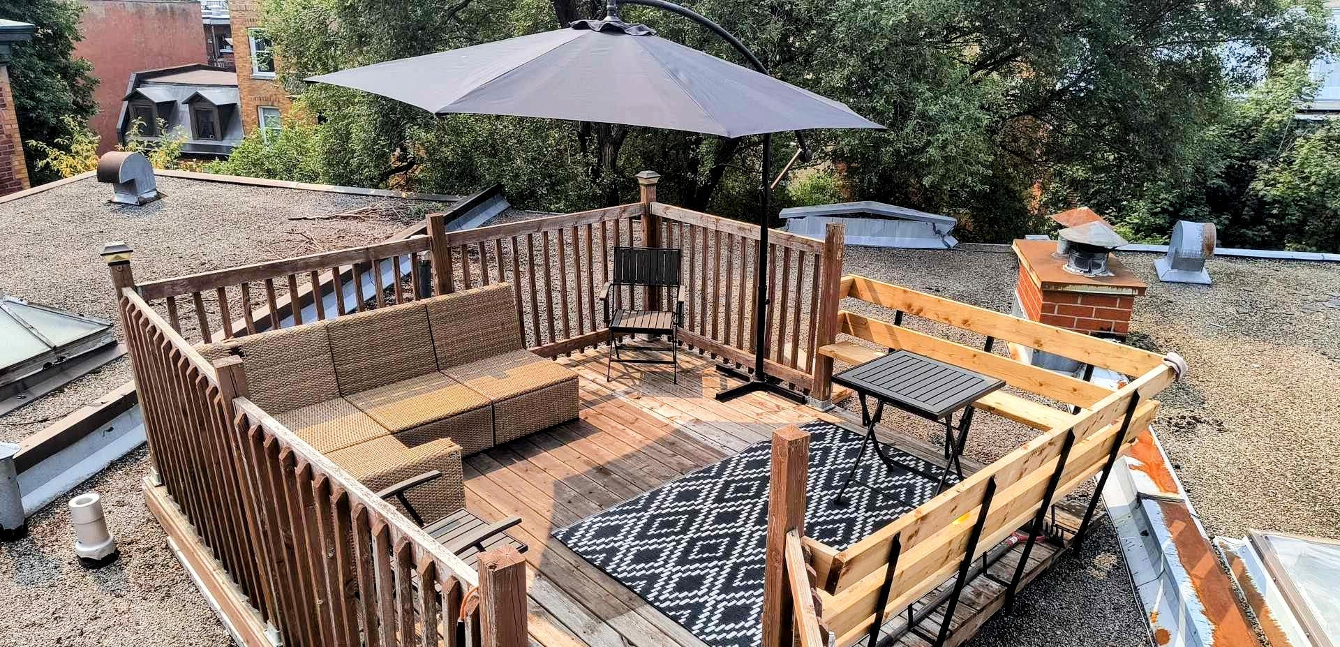Un charmant 4 ½ + : 2 grandes chambres fermées plus un espace de rangement-salle de lavage. Situé au 2e étage d’un duplex, terrasse exclusive sur le toit et balcon avant. La location comprend : cuisinière, frigo, laveuse, sécheuse, four micro-ondes, climatiseur, un lit mural.