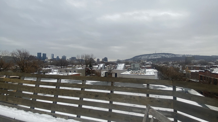 Wonderful modern condo on 2 levels with 2 bedrooms, a master bathroom and a large powder room. Large windows flood the spaces with an abundance of nature light. Situated on the top floor with a private terrace and views overlooking Mont-Royal, downtown, and even the fireworks at La Ronde during the summer. Built in 2013, the open concept condo has an area of 750 square feet (70m2) with a double height space reaching 17 feet high overlooking the kitchen with island.