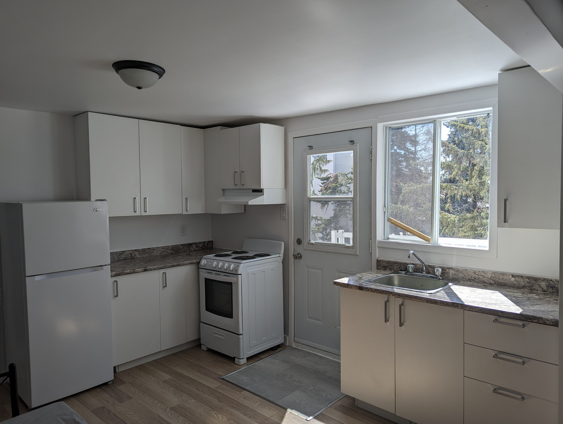 Chauffé, éclairé et meublé (poêle, frigidaire, divan, set de cuisine, lit et air climatisé)