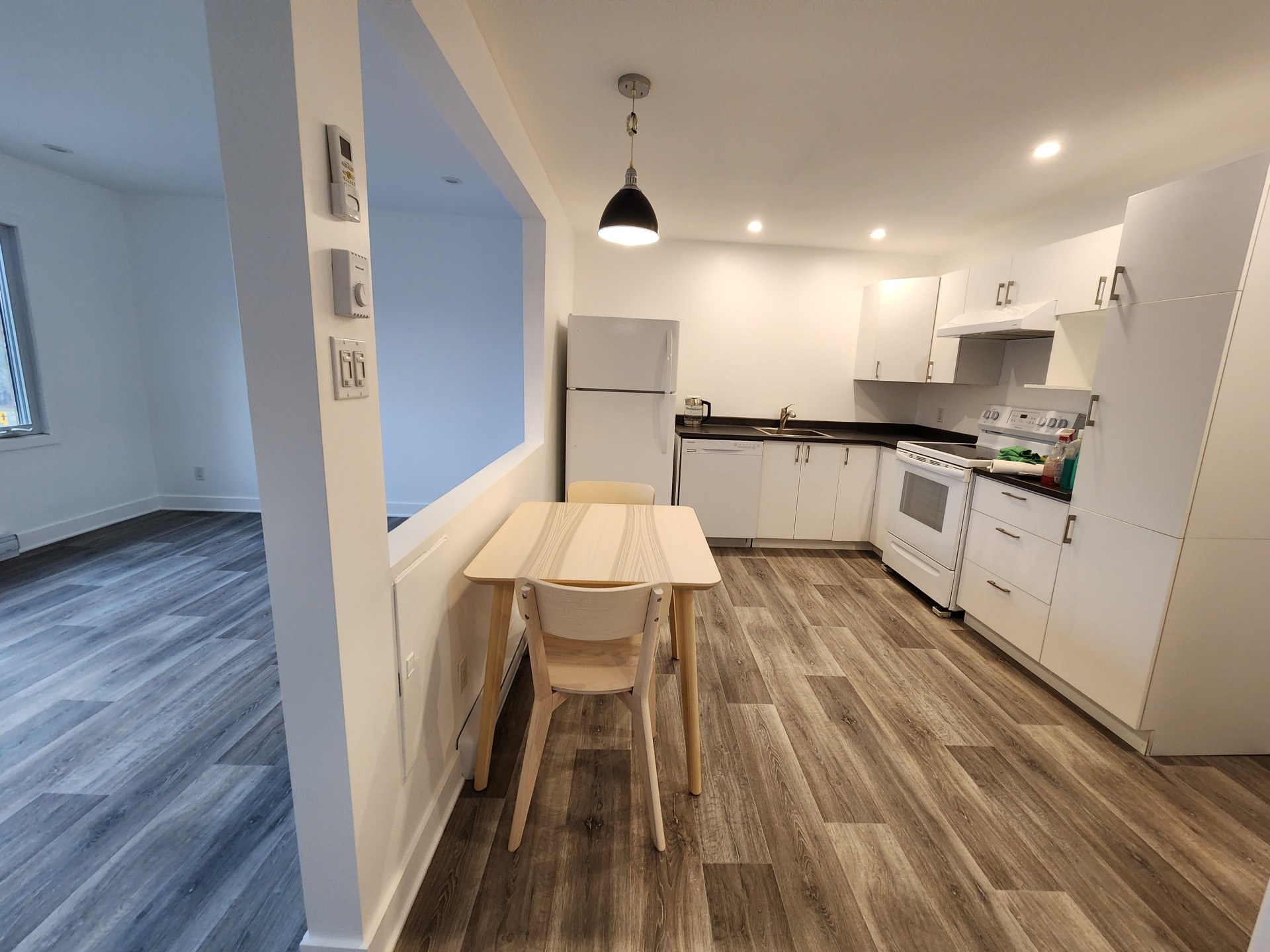 Magnifique 2 1/2 fraichement rénové, incluant laveuse sécheuse, lave vaisselle, air climatisé et grand espace de rangement. Wifi fourni