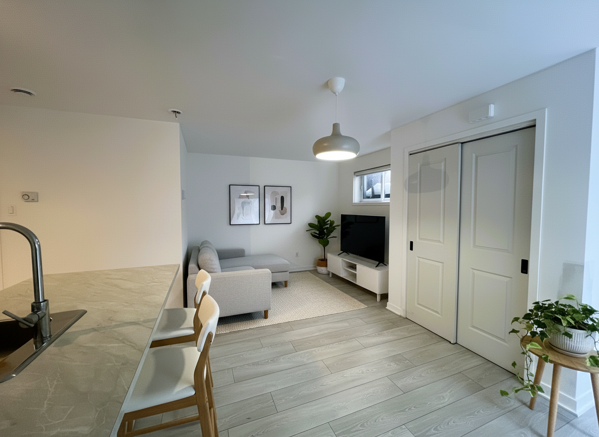 Son espace de vie à aire ouverte, combinant un salon convivial et une cuisine équipée, crée une atmosphère accueillante et fonctionnelle.