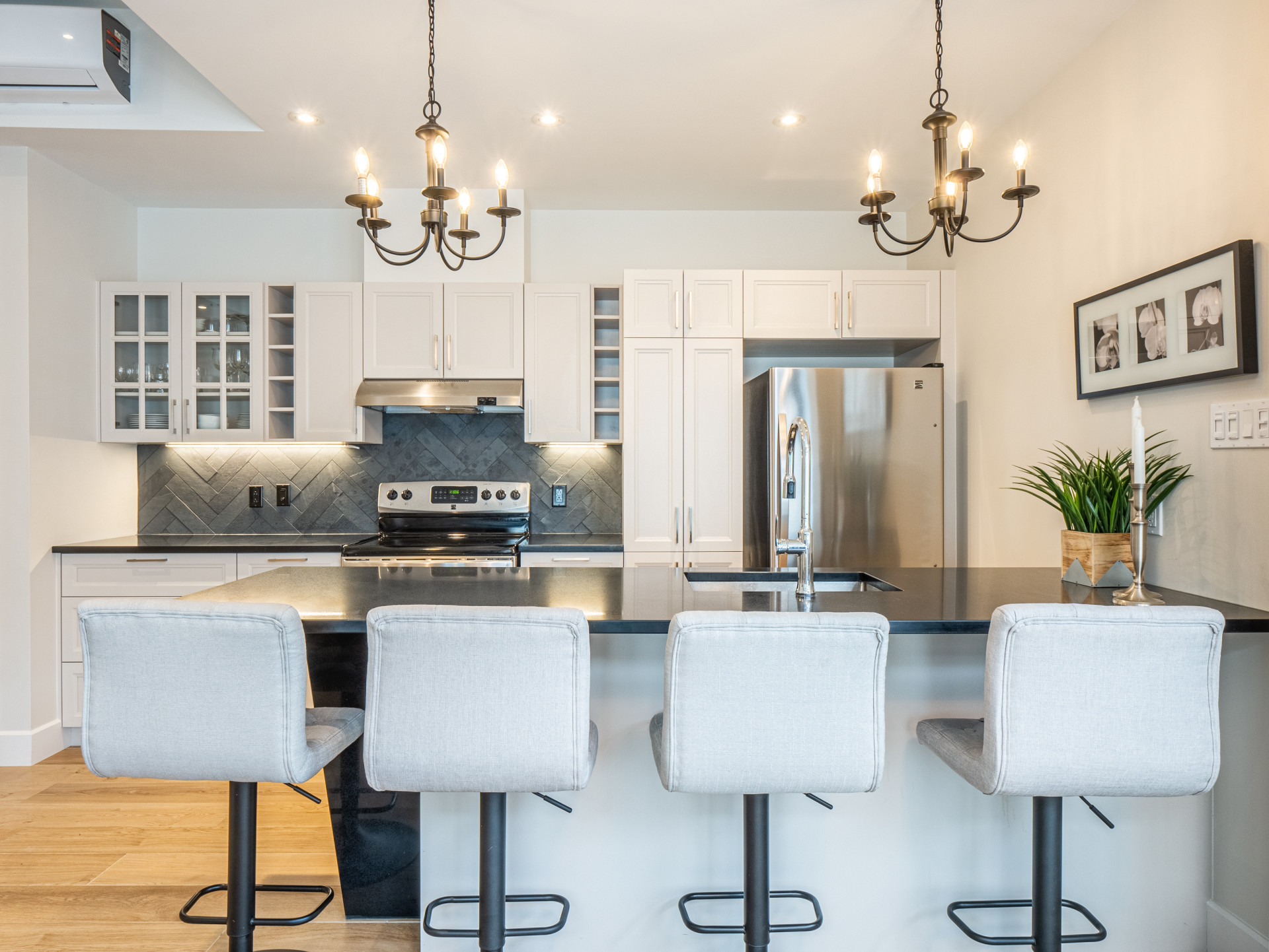 L'appartement se distingue par une aire de vie lumineuse avec de grandes fenêtres et des plafonds élevés, mettant en valeur une cuisine moderne dotée d'un vaste îlot en quartz, d'un élégant dosseret en chevrons et d'électroménagers en acier inoxydable. Le salon convivial, équipé d'un téléviseur mural et d'un coin bureau, offre un cadre agréable et fonctionnel. Vous disposerez également d'une chambre fermée très confortable et d'une salle de bain contemporaine aux finitions soignées avec un meuble-lavabo en bois et une baignoire-douche vitrée. À l'arrière, une terrasse privée vous permettra de profiter pleinement des beaux jours.