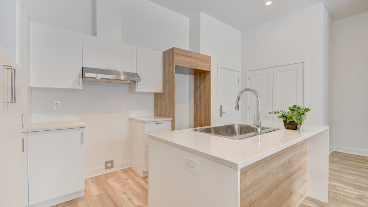 Unité 409 - Spacieuse unité de 1031 pi2, 2 chambres, 2 salles de bain, espace bureau, cuisine avec îlot central et balcon de 63 pi2 à 2 500$ par mois. Disponible pour occupation immédiate.