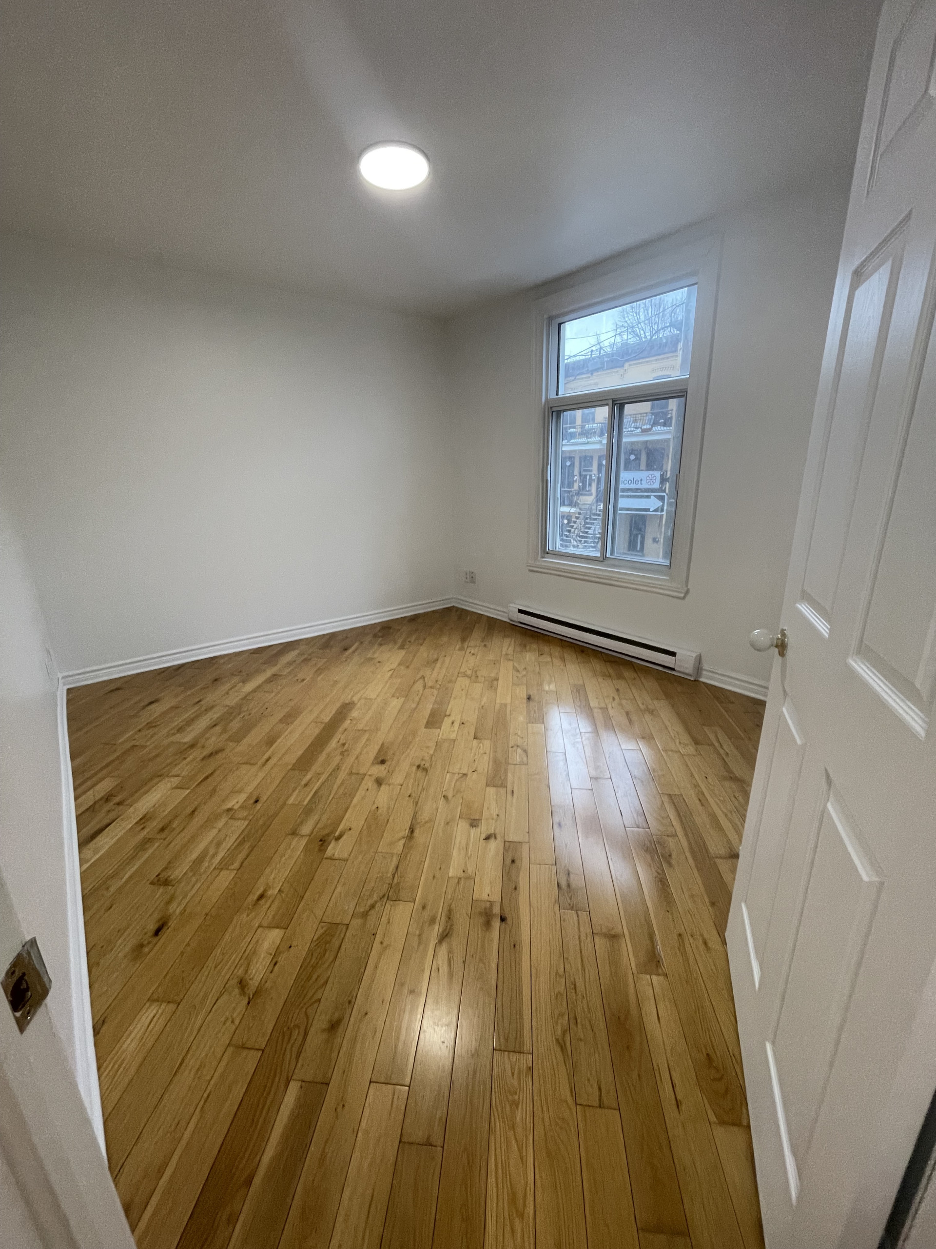 Chambre 1 : 9’ X 10’ avec fenêtre, garde-robe simple et plancher de bois