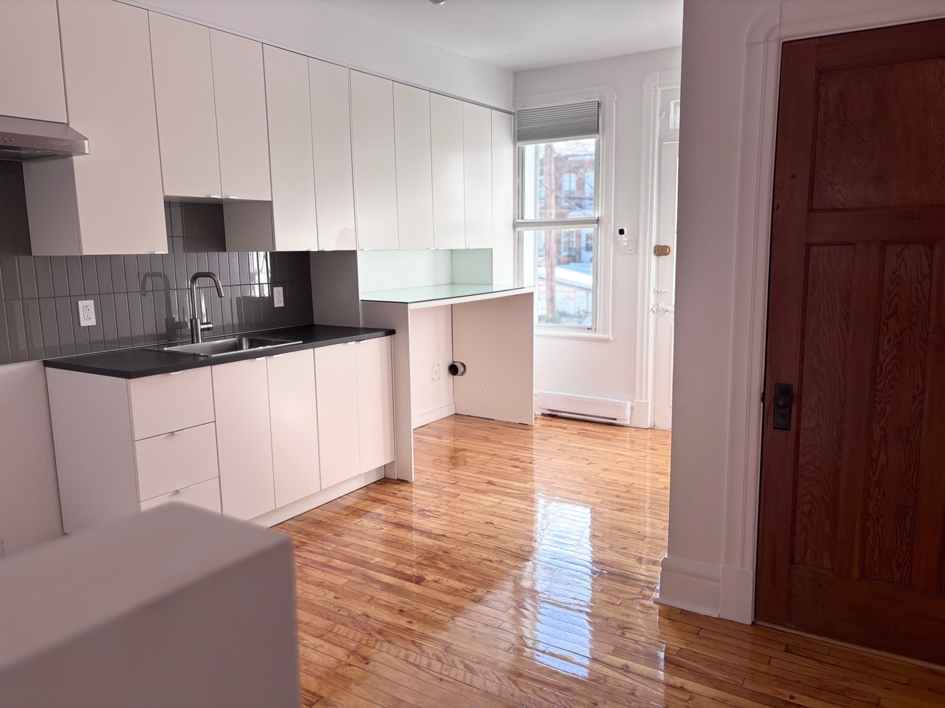 Très beau et grand logement 4 ½ avec chambre double (bureau) , deux chambres fermées avec option bureau, situé dans un triplex tranquille, sur une des plus belles rue d'Hochelaga.