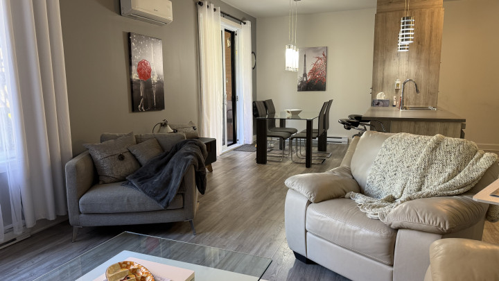 Cuisine et salon sont à aires ouvertes, 2 chambres et 1 salle de bain au coût de 1800 $ / mois. Ce logement est située à 5 minutes à pied du supermarché du Vieux-Village et de la navette gratuite pour la montagne. (Vous pourrez vous y rendre chaussé de vos bottes de ski).