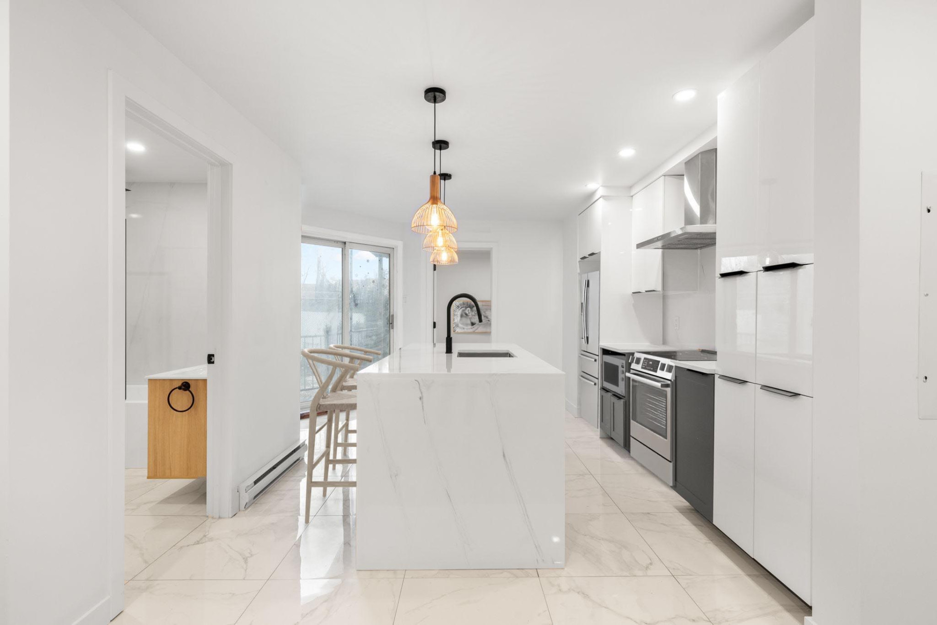 La cuisine, véritable pièce maîtresse de l'appartement, séduit par son design contemporain : dalles de céramique au sol, îlot central avec comptoir en quartz, électroménagers haut de gamme, nombreux rangements et grande baie vitrée donnant sur l'extérieur. La salle de bain est également soignée, avec une baignoire-douche vitrée moderne et un espace laveuse-sécheuse bien intégré.
