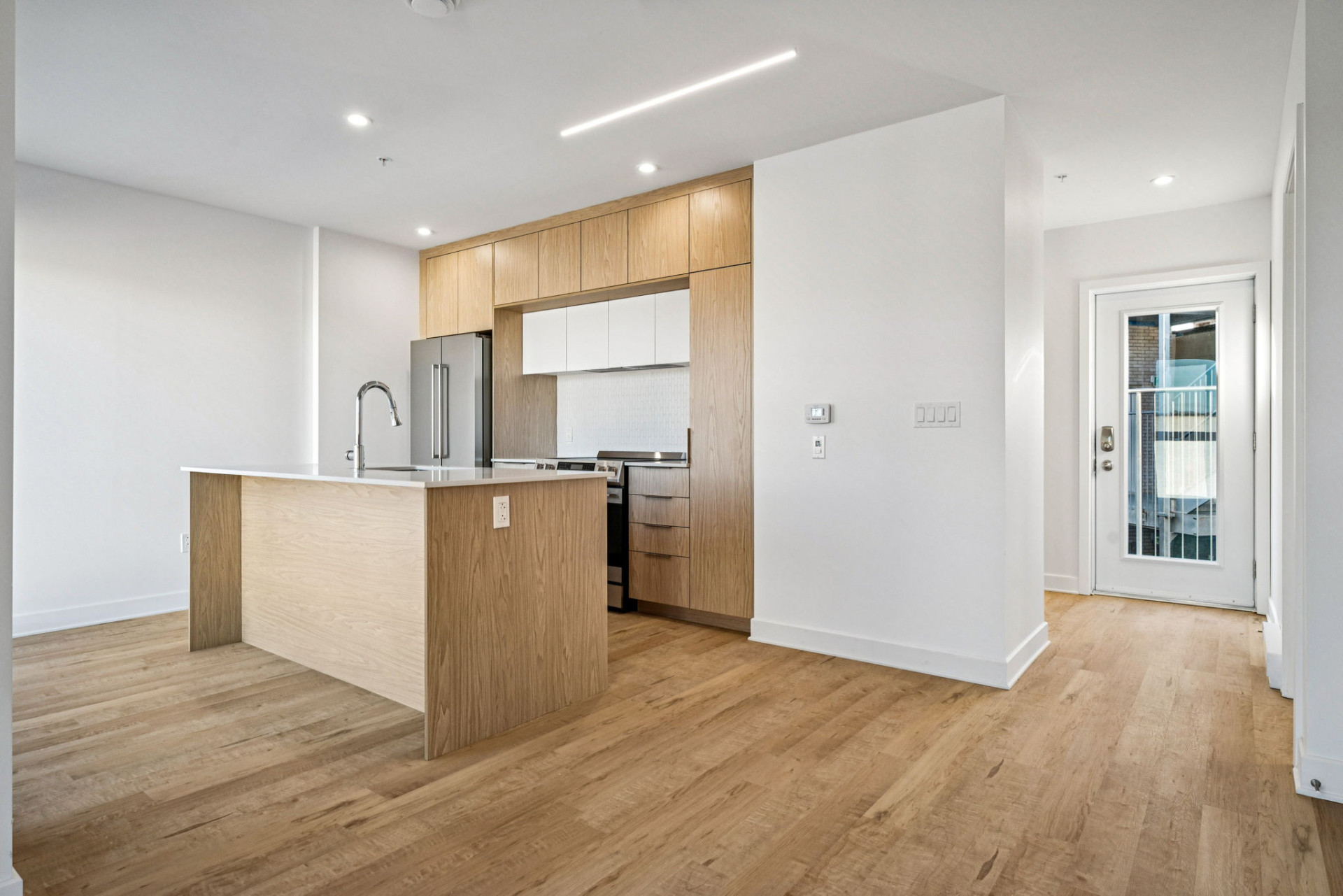 Les deux chambres fermées, aux belles superficies et dotées de grandes fenêtres, bénéficient d'une lumière naturelle abondante. La salle de bain moderne est équipée d'une baignoire-douche vitrée et d'un meuble-lavabo au style épuré, tandis qu'un coin buanderie avec laveuse et sécheuse complète l'ensemble.