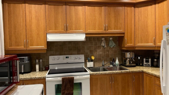 Cuisine avec porte patio, balcon arrière