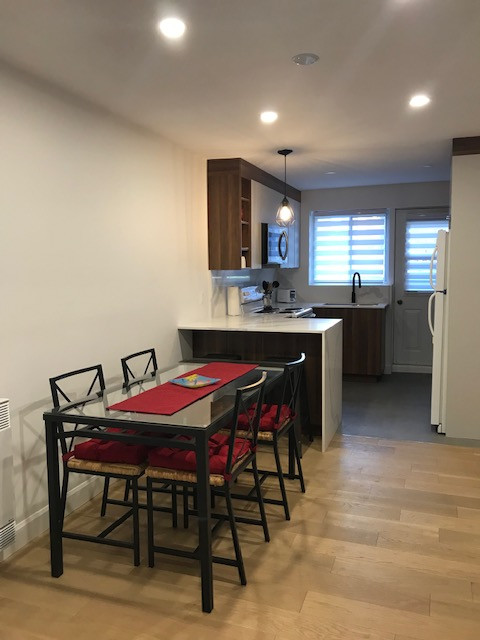 L’immeuble se trouve être un 8plex, l’appartement est en demi sous-sol, très clair, les locataires (à majorité étudiants 1er et 2ème cycle) sont sympas et courtois, plancher de lattes de 6,5’’ de large en chêne blanc brossé et céramique 4 x 4 grise couleur béton, comptoirs en quartz, thermostats électroniques dans toutes les pièces.