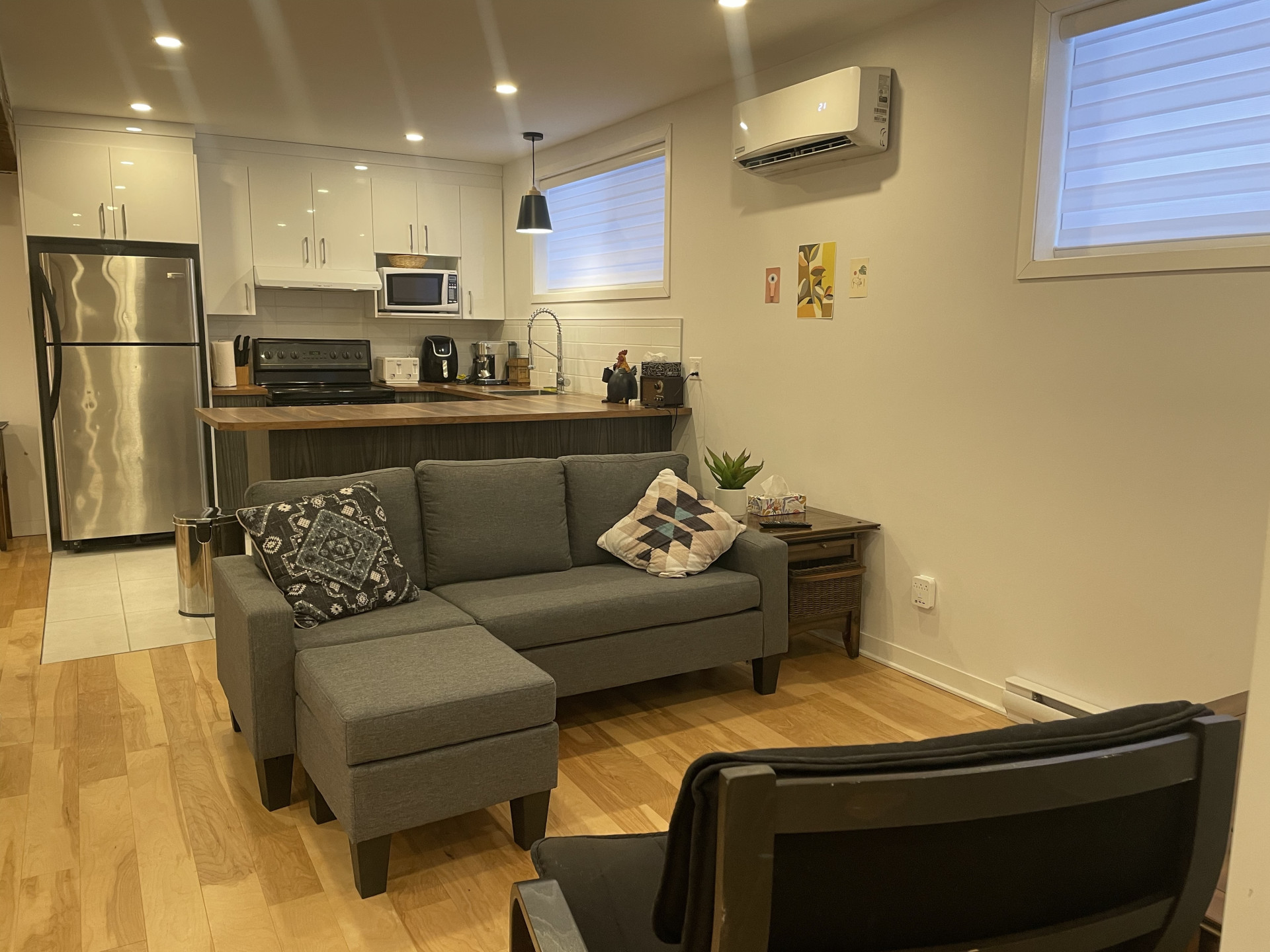 Tranquille 4 ½ situé au demi-sous-sol d’un duplex. Lumineux et entretenu avec soin. 800 pieds carrés. 2 chambres fermées. Wifi. Air climatisé. Meublé. Accessoires de cuisson et literie sont à disposition. Vous n’avez qu’à apporter vos effets personnels.