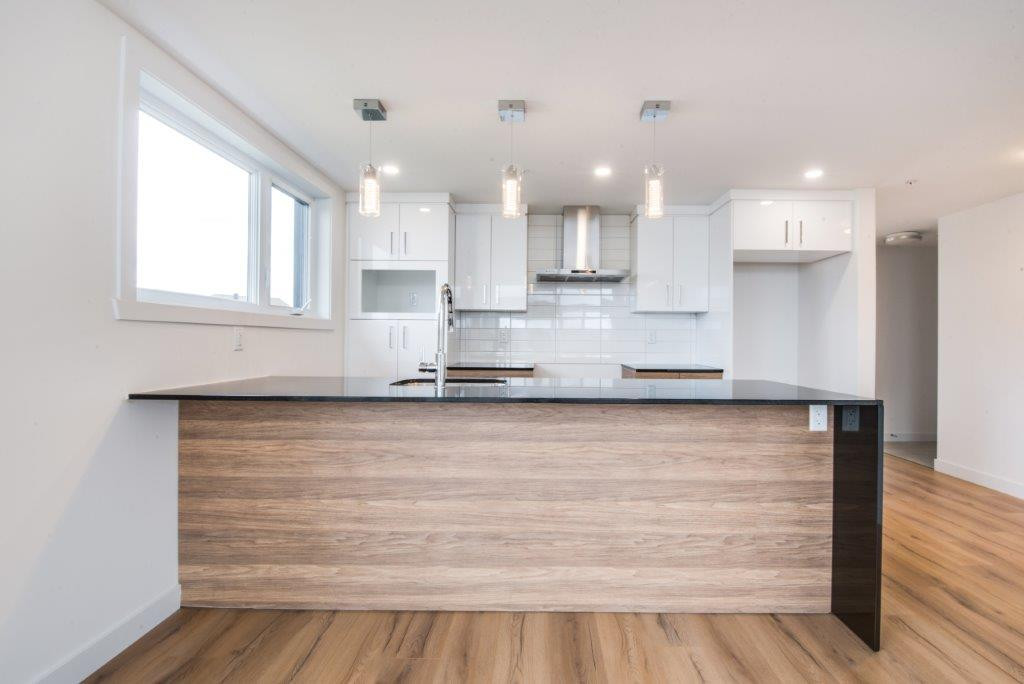 Finition haut de gamme, avec comptoir de granite, douche céramique et verre, bain auto portant, thermopompes.
