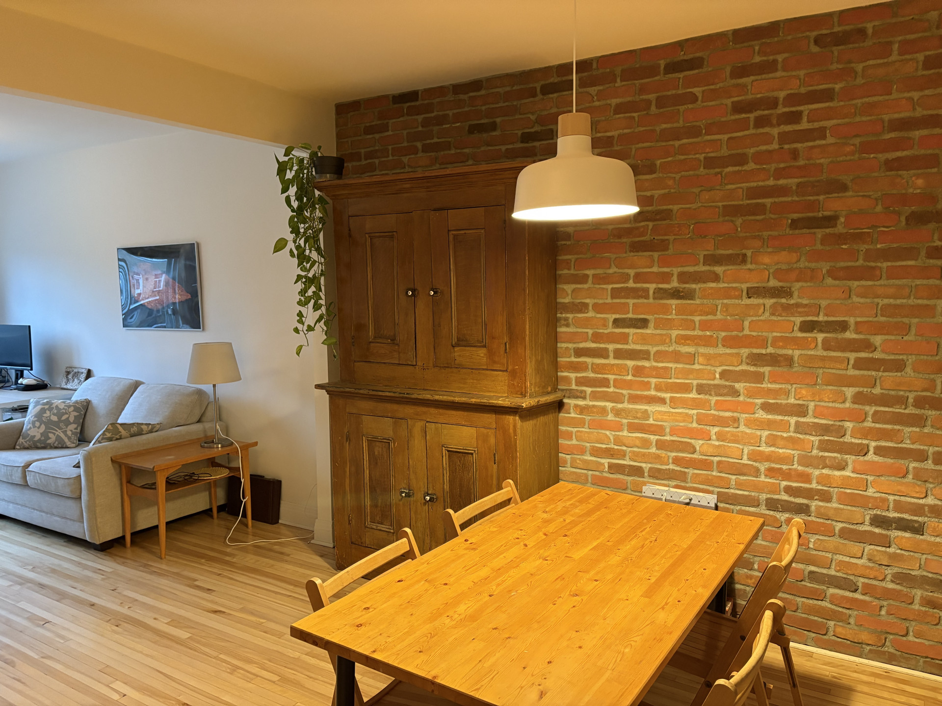 Salon ouvert avec salle à manger dont un des murs est en briques, ce qui lui donne un beau cachet.