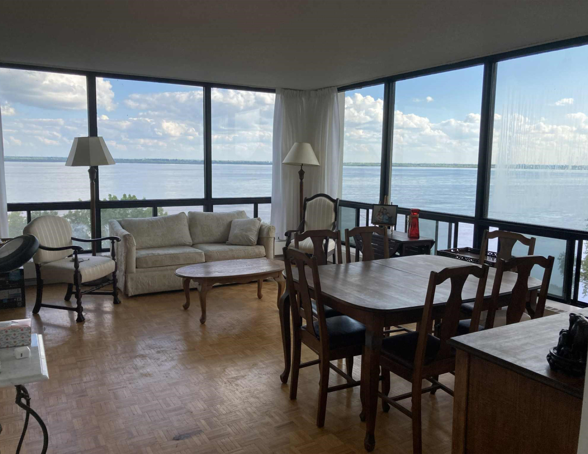 Le très grand salon (22’x14’) est muni d’immenses fenêtres plafond/plancher et offre une vue extraordinaire sur le Fleuve St-Laurent et ses environs. Ces immenses fenêtres sont aussi présentes dans les 2 chambres à coucher. Les rideaux sont fournis.