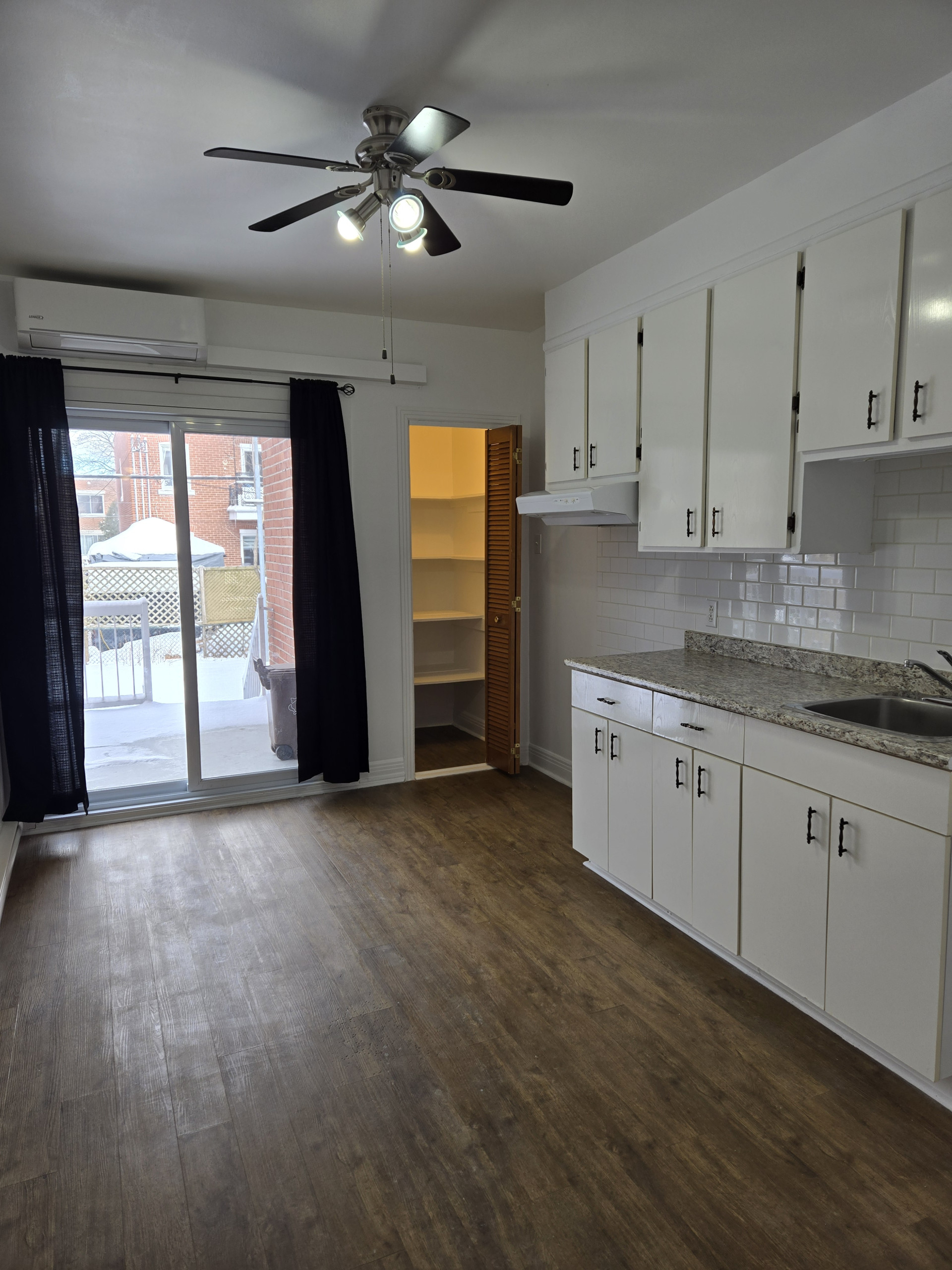 Une chambre à coucher fermée. Pièce du milieu avec porte française donnant sur le salon, cuisine avec garde-manger, salle de bain rénovée avec puits de lumière.
