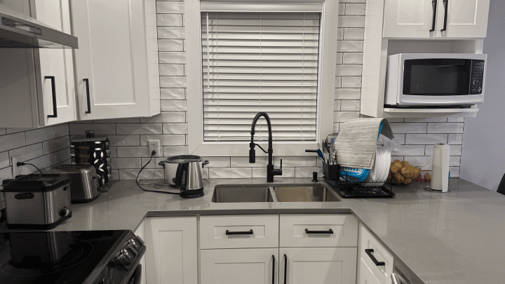 • Cuisine semi fermée : électroménagers inclus (réfrigérateur, cuisinière, laveuse, sécheuse, lave-vaisselle)