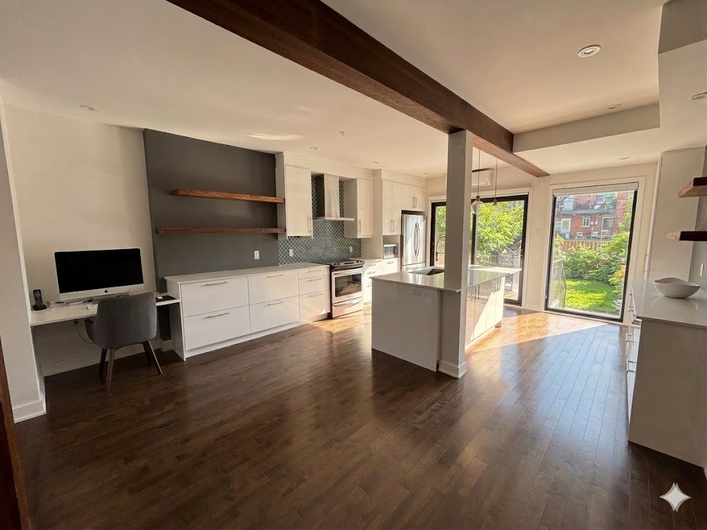 Magnifique rez-de-chaussée de triplex entièrement rénové avec l’aide d’un architecte en 2017, offrant près de 1500 pi² d’espace lumineux à aire ouverte, avec mur arrière entièrement fenestré donnant sur vaste cour privée de 4300 pi².