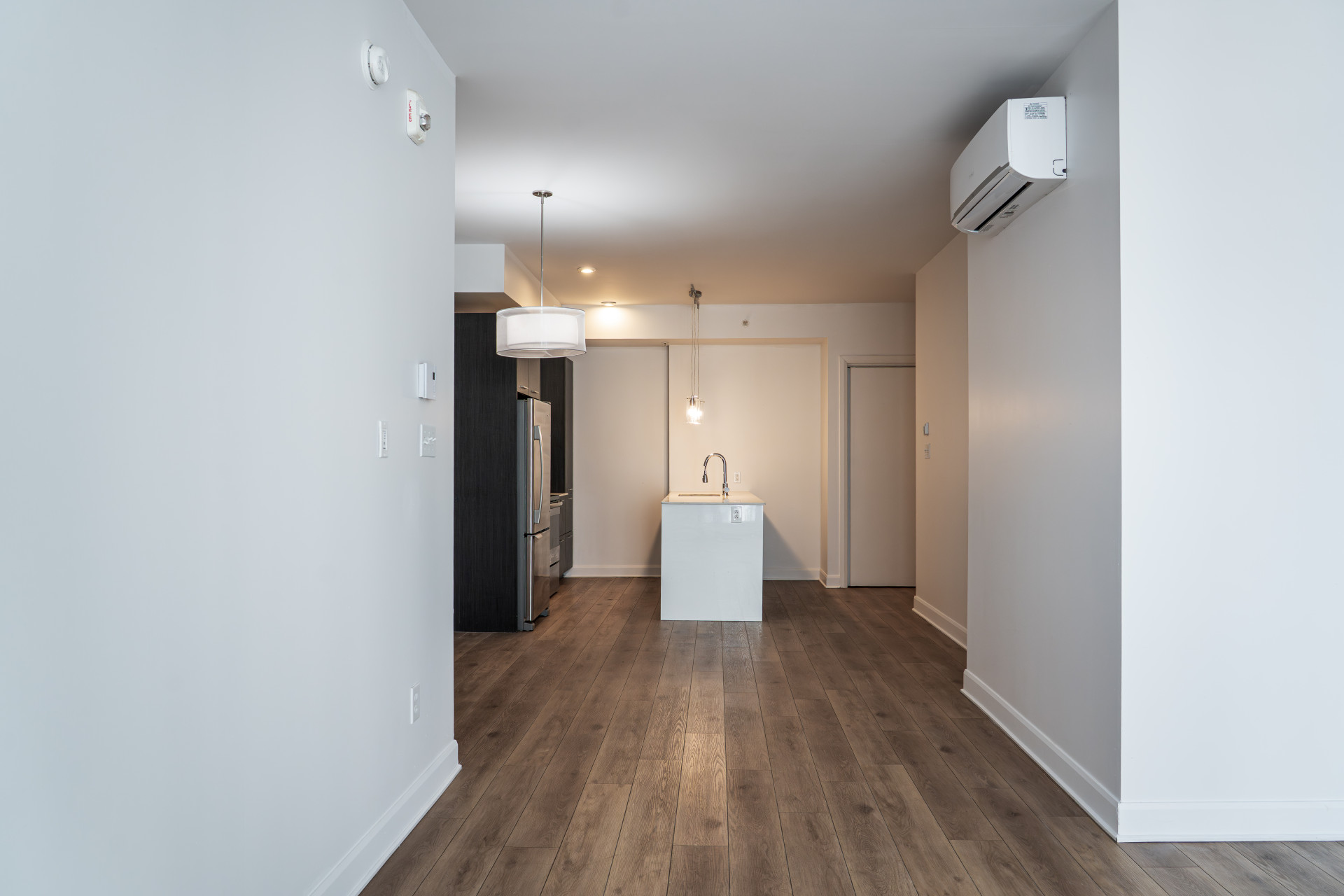 Unité spacieuse et lumineuse avec aire ouverte, cuisine complète (frigo, cuisinière, lave-vaisselle) et laveuse/sécheuse dans l’unité.