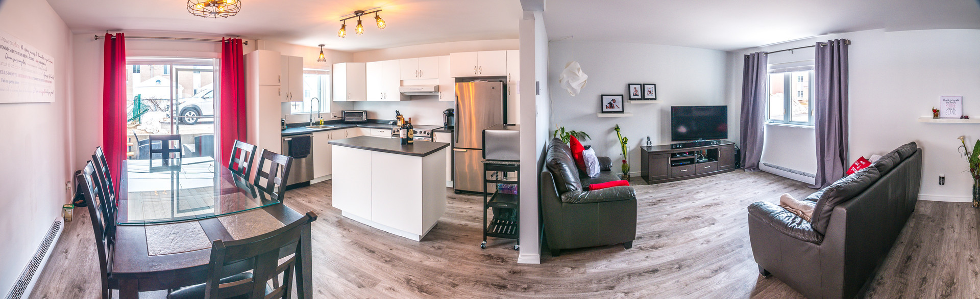 Aire ouverte avec grand salon et grande cuisine avec îlot ensoleillée grâce à porte-patio. Noter que le plancher de cuisine et la salle de bain sera refait en céramique.