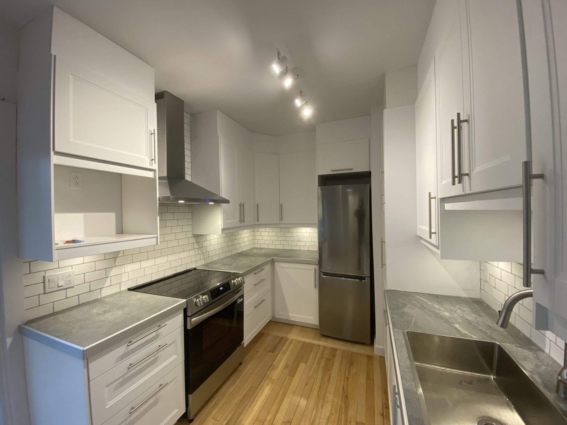 Cuisine moderne et fonctionnelle avec électroménagers inclus (réfrigérateur, cuisinière, lave-vaisselle, laveuse/sécheuse)