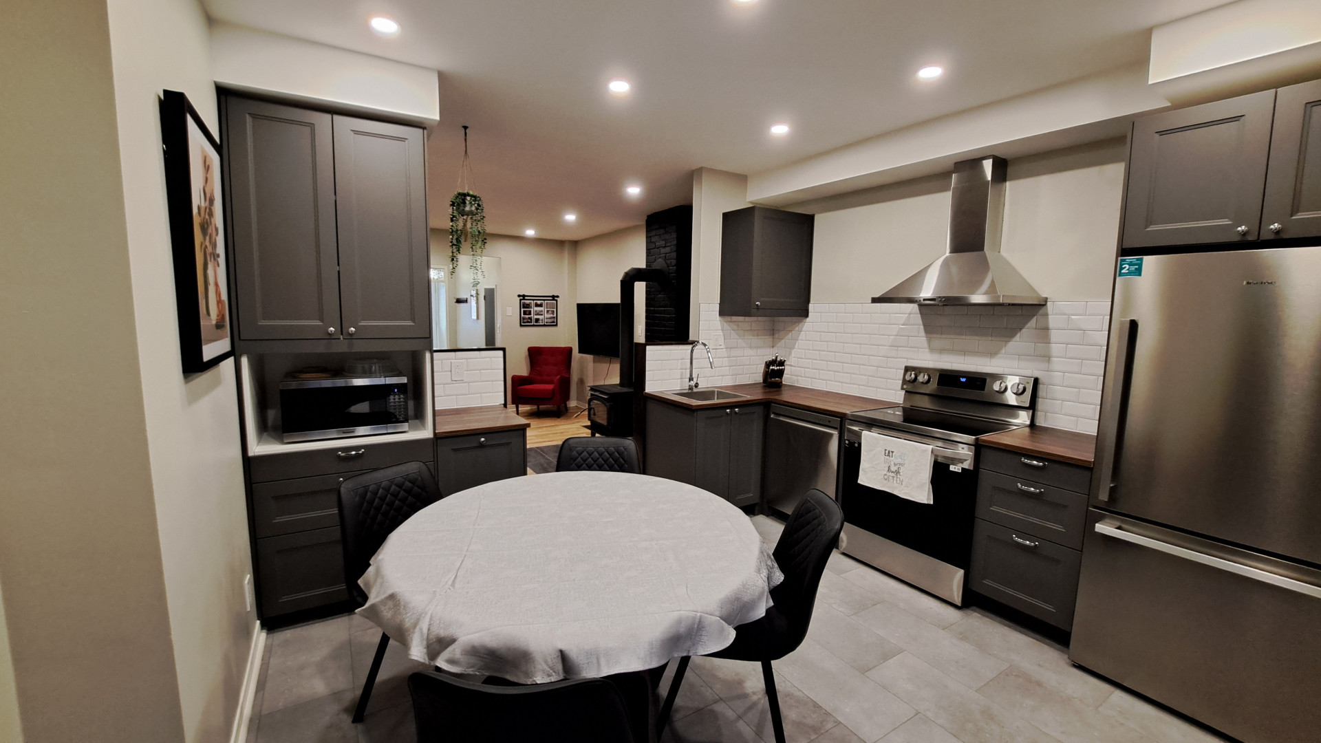 Le salon est équipé d'un foyer à combustion lente entièrement fonctionnel, comprend un sofa sectionnel, un fauteuil, une télé intelligente 54 pouces et un pouf.