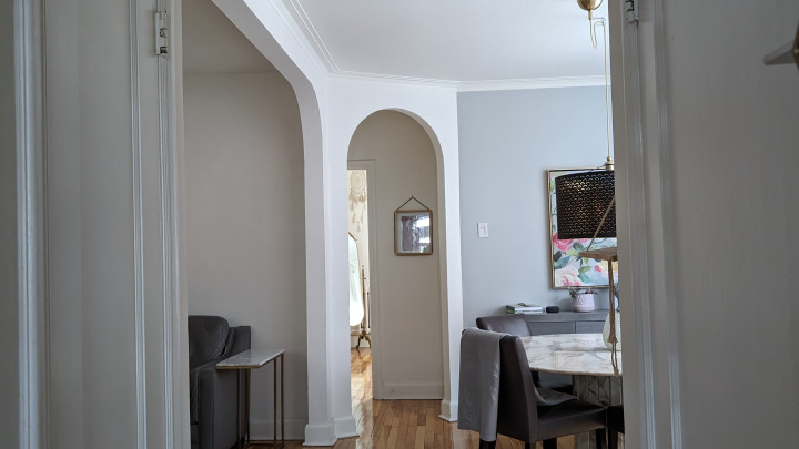 - Superbe appartement 6½ spacieux, lumineux et rénové avec 3 chambres à coucher, un salon double et un balcon. Situé au 1er étage d’un 5-plex très calme.