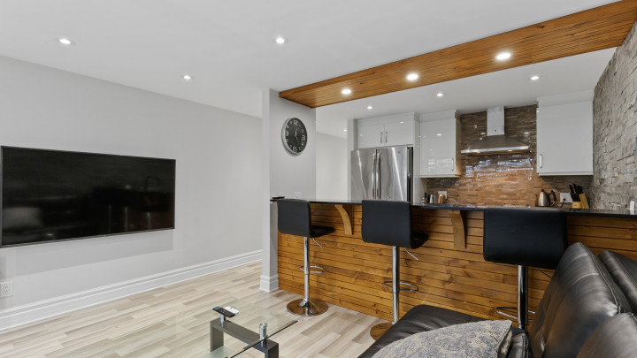 - Mur en bois décoratif dans la cuisine et le salon/chambre