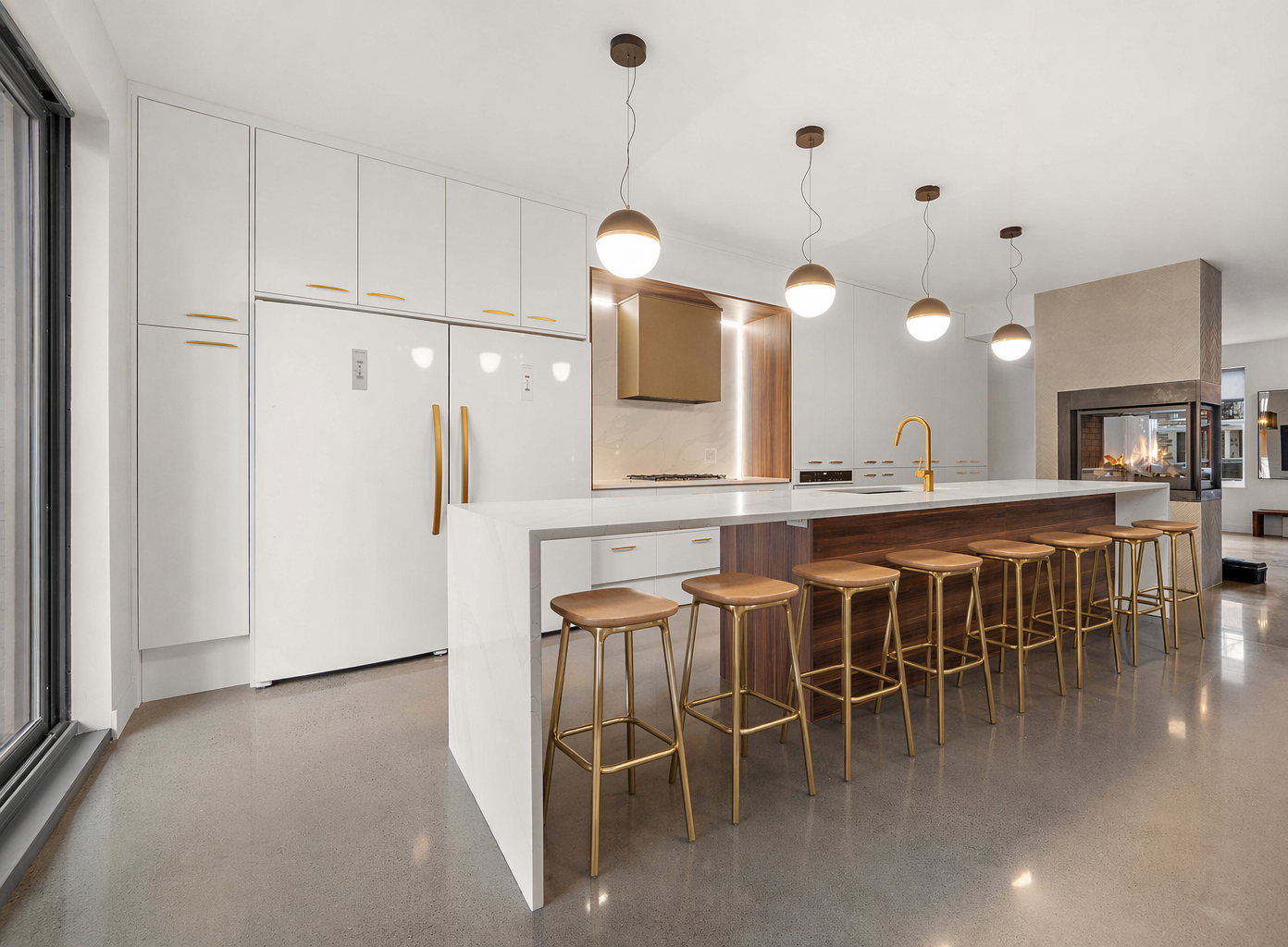 Le plancher de béton poli avec chauffage radiant assure un confort absolu en toute saison, tout en conférant un cachet moderne et épuré. Le foyer double-face au gaz, habillé de béton ciré, apporte chaleur et élégance, créant une ambiance unique entre les espaces de vie.