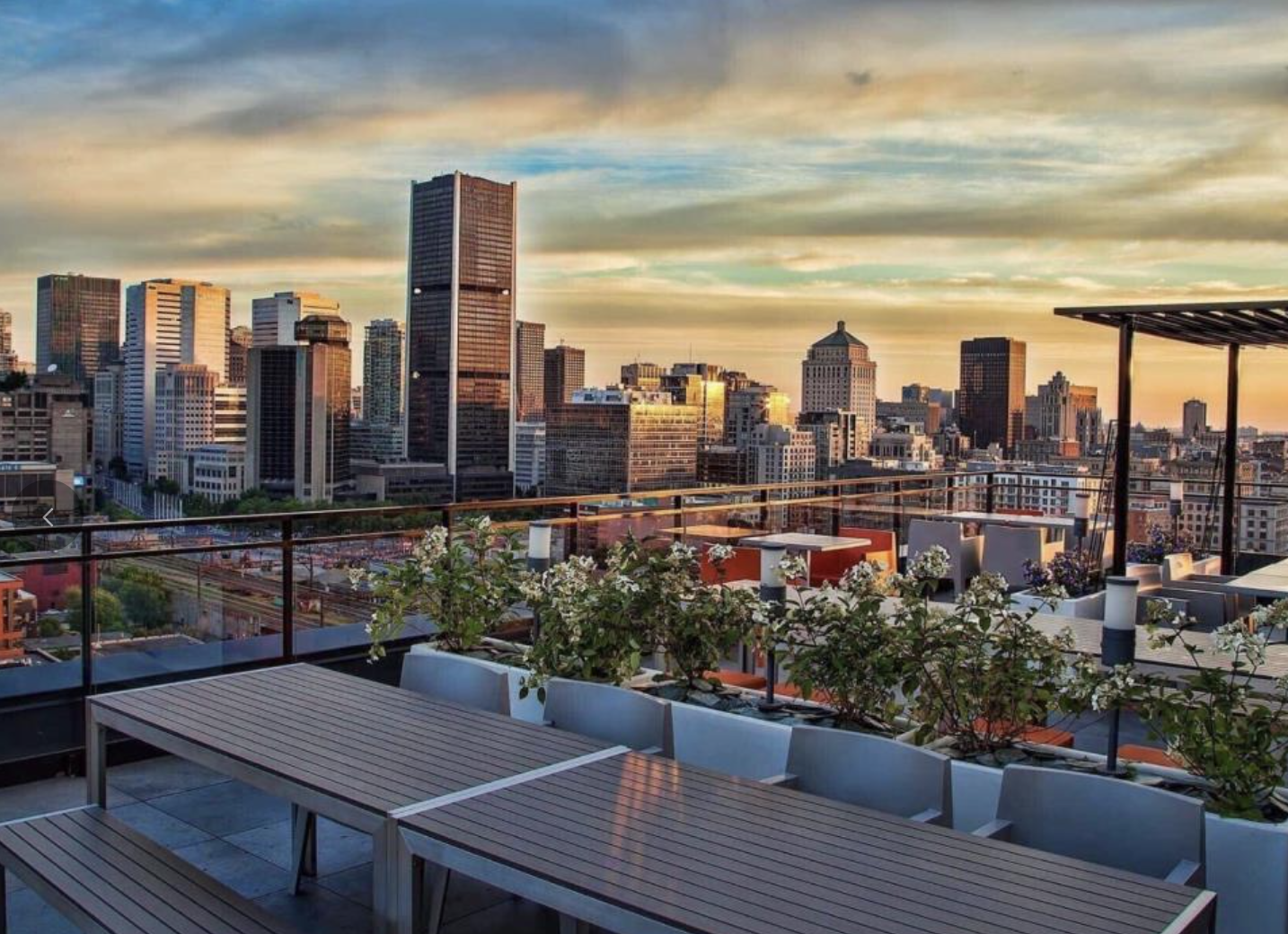 Chalet urbain au 21e étage avec vue sur le centre-ville de Montréal et le fleuve Saint-Laurent.