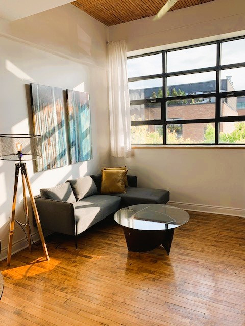 • Aire ouverte salon + cuisine avec grandes fenêtres pleine hauteur (plein sud), plafond de 14 pieds de haut en mill-floor, superbes planchers en bois recyclés vernis