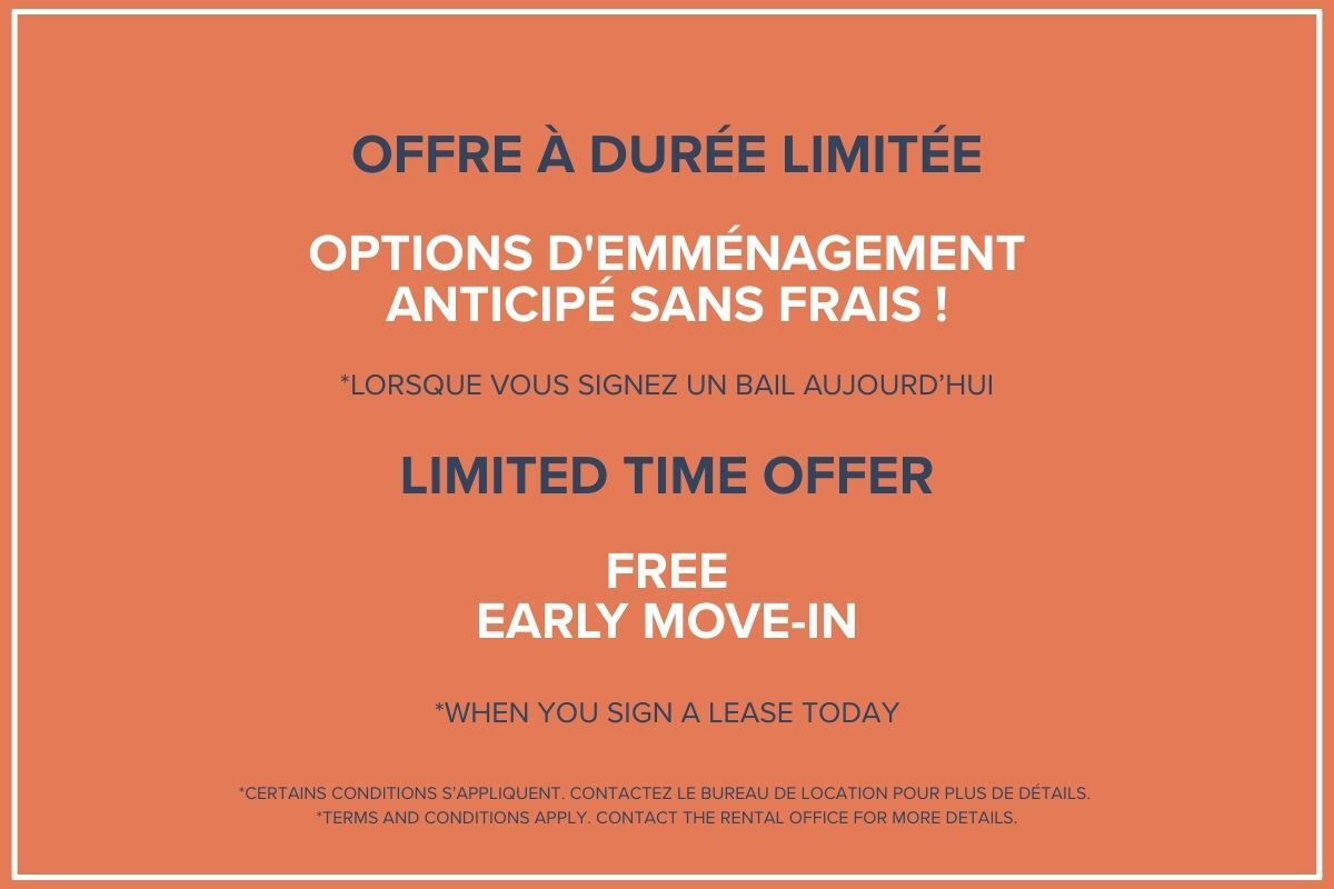 Découvrez le mélange parfait de culture et de praticité aux Appartements Dominik, l’une des propriétés locatives les plus recherchées de Montréal. Choisissez parmi une variété d’appartements dotés de garde-robes, d’une buanderie commune, de balcons privés, de fenêtres s’étendant du sol au plafond et de finitions modernes comme des comptoirs en pierre et des appareils électroménagers en acier inoxydable. Les équipements de l’immeuble comprennent une salle de sport entièrement équipée, un local à vélos, des casiers à colis, une supérette sur place et une vue imprenable sur la ville. Avec une climatisation centrale, des ascenseurs et des installations de blanchisserie sur place ou dans l’appartement, les appartements Dominik offrent tout ce dont vous avez besoin pour vivre en toute tranquillité.